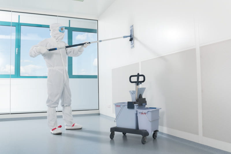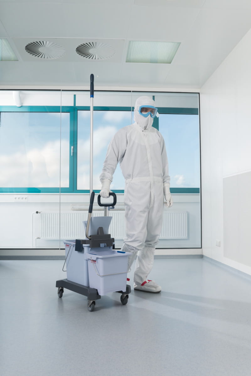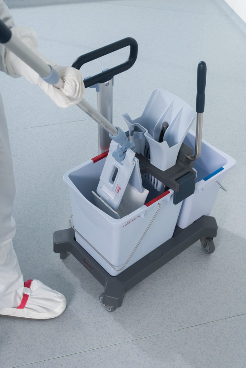 Wszystkie części systemu nadają się do dezynfekcji w autoklawie, mopy z poliestrowych mikrowłókien pozostawiają mało cząstek na powierzchni i zapewniają wyjątkową skuteczność czyszczenia. Bezdotykowe wyżymanie mopów znacznie zmniejsza ryzyko zanieczyszczenia krzyżowego, a użytkownik kontroluje stopień nawilżenia mopa wymagany do dezynfekcji i usunięcia zanieczyszczeń. Dodatkowo kompaktowa platforma jezdna doskonale nadaje się do stosowania w obiektach o ograniczonej ilości miejsca do przechowywania, jest lekka, ergonomiczna i bardzo łatwa w użyciu.