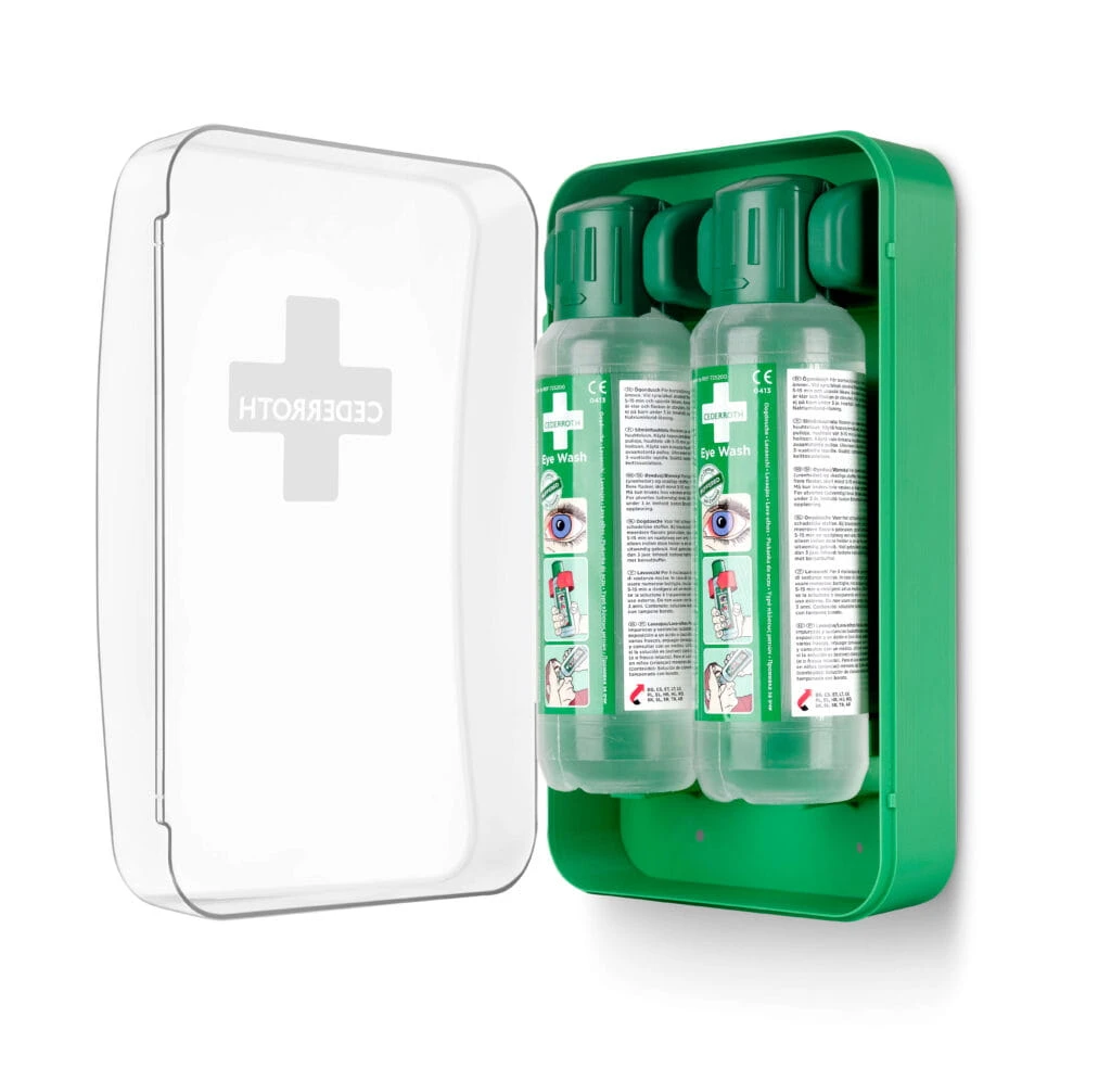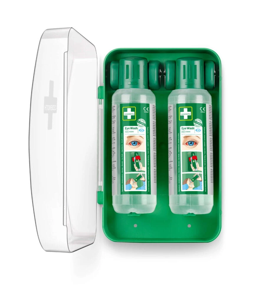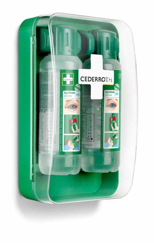 Kompaktowa szafka na płukankę do oczu, która chroni przed kurzem i wodą. Zawartość: 2 butelki płukanki do oczu Cederroth. Łatwo znaleźć na nią miejsce nawet w niewielkim pomieszczeniu. Przejrzyste drzwiczki zwiększają widoczność. Butelki otwierają się automatycznie w momencie ich wykręcenia z szafki i od razu można rozpocząć przemywanie.