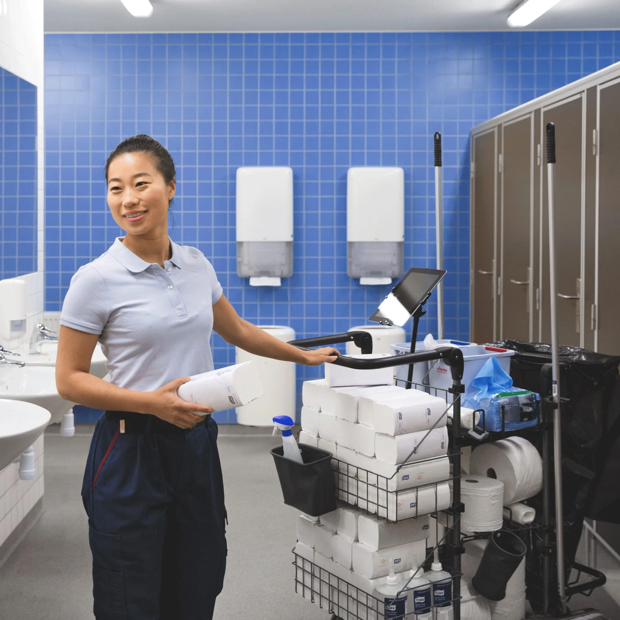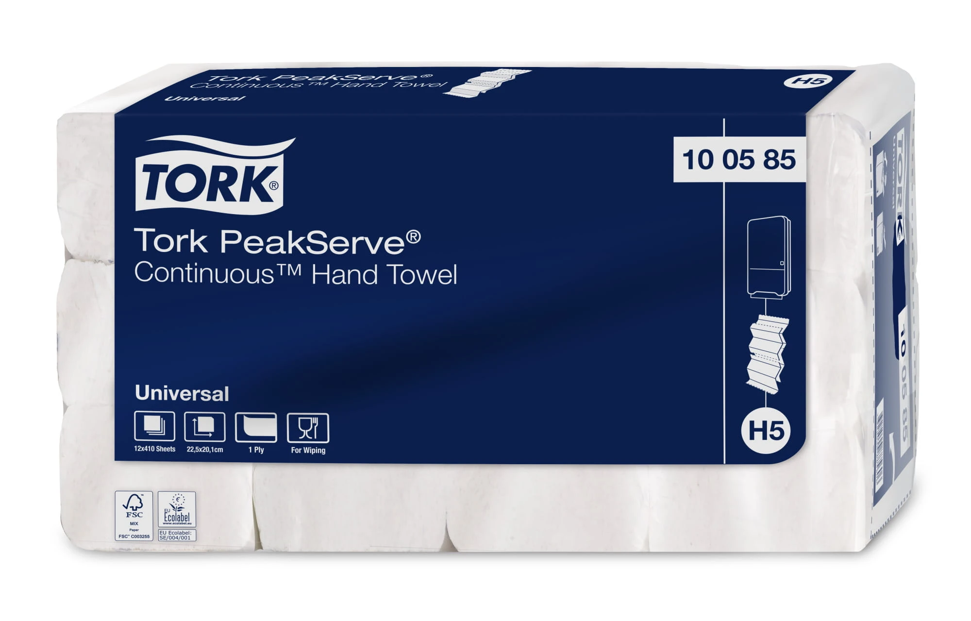 Tork PeakServe®: najnowsza innowacja stworzona z myślą o łazienkach o dużym natężeniu ruchu, gdzie priorytetem jest krótki czas sprzątania oraz niezakłócony przepływ gości. System jest kompatybilny z Tork PeakServe® Continuous™ z niekończącymi się ręcznikami do rąk. Zawiera 2100 ręczników, które są dozowane szybko i płynnie, co przyspiesza przepływ użytkowników. Skompresowane wkłady zapewniają szybkie uzupełnianie. Można je dokładać w każdej chwili, a ich rozmiar ułatwia przechowywanie i transport, dzięki czemu personel może skupić się na sprzątaniu, a nie na wymianie wkładów.