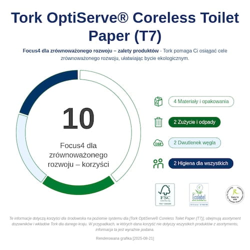 Tork OptiServe® to system dozowników o dużej pojemności dla obiektów, w których wydajność, zrównoważony rozwój i zapewnienie doskonałych wrażeń są kluczowe. To lepszy wybór w porównaniu z konwencjonalnym papierem toaletowym i tradycyjnymi rolkami jumbo. Szeroka oferta dozowników pozwala zaspokoić różne potrzeby w całym obiekcie z pomocą jednego rodzaju papieru toaletowego.