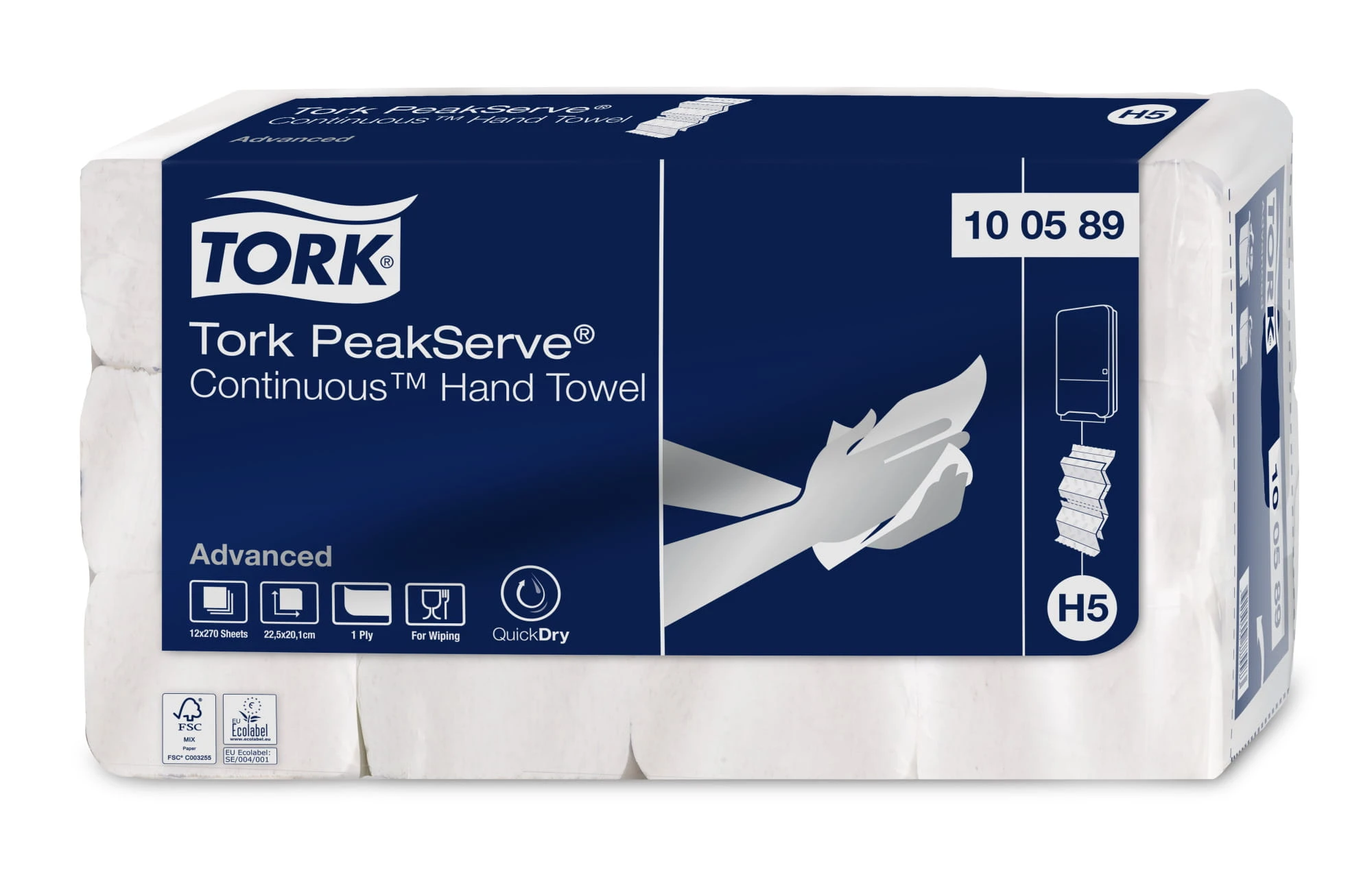 Zaskocz gości ręcznikiem do rąk Tork PeakServereg w jakości Advanced. Skutecznie osusza dłonie i wyróżnia się atrakcyjnym tłoczonym dekorem w kształcie szarego listka. Tork PeakServe®: najnowsza innowacja stworzona z myślą o łazienkach z dużym natężeniem ruchu, gdzie priorytetem jest krótki czas sprzątania oraz sprawny przepływ gości. System jest kompatybilny z dozownikiem Tork PeakServe. Mieści ponad 2100 ręczników, które są dozowane szybko i płynnie, co przyspiesza ruch w łazience. Skompresowane wkłady zapewniają szybką wymianę. Można je dokładać w każdej chwili, a ich rozmiar zapewnia łatwe przechowywanie i transport, dzięki czemu personel może skupić się na sprzątaniu.