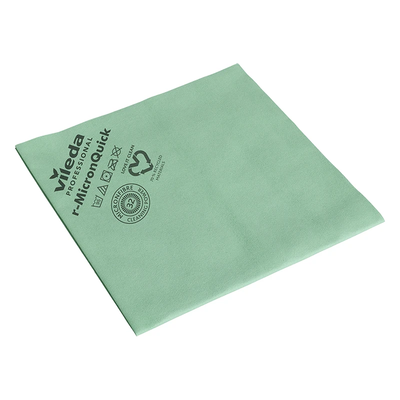MicronQuick to trwała ściereczka z możliwością prania od spółki Vileda Professional. Ściereczka składa się w 70% z mikrowłókien z recyklingu, które zapewniają doskonałe wyniki sprzątania nawet w przypadku struktur mikroskopijnych i usuwają nawet 99,99% wirusów i bakterii przy pomocy samej wody. Z tego powodu ściereczka r-MicronQuick jest idealna do sprzątania obszarów w ośrodkach zdrowia, w których wymagane jest utrzymanie wysokiego poziomu czystości i higieny. System kodowania kolorystycznego obejmujący cztery kolory umożliwia rozróżnianie ściereczek, co obniża ryzyko ewentualnego przenoszenia zarazków.